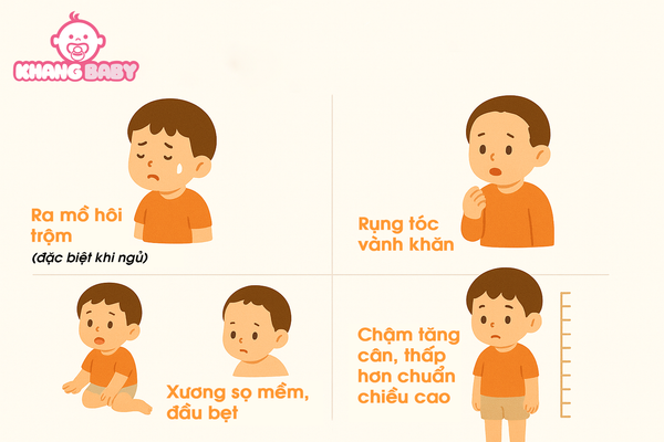 - Thiếu Vitamin D → Cản trở hấp thu và chuyển hóa canxi, làm xương mềm, chậm mọc răng, hay quấy khóc.