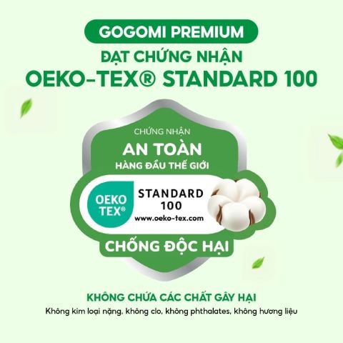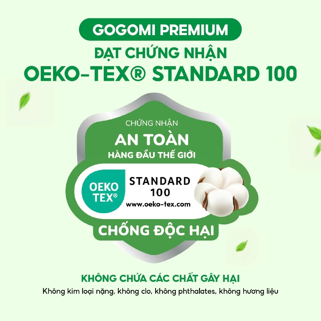 Gogomi tự hào đạt gần 20 chứng nhận quốc tế danh giá, khẳng định uy tín và chất lượng hàng đầu qua từng sản phẩm. Đặc biệt, chứng nhận OEKO-TEX® STANDARD 100 Level 1 – tiêu chuẩn cao nhất về độ an toàn và chống độc hại, đảm bảo sự an toàn tuyệt đối cho làn da nhạy cảm của bé yêu.