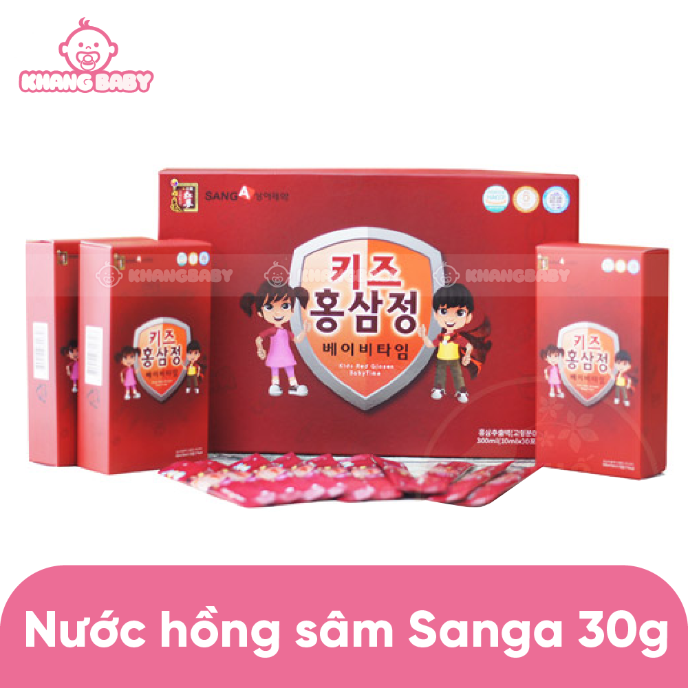 Nước hồng sâm em bé Sangađược đóng 30 gói trong hộp rất tiện lợi. Sản phẩm với tone màu đỏ chủ đạo như những chiếc kẹo thu hút sự chú ý của bé.