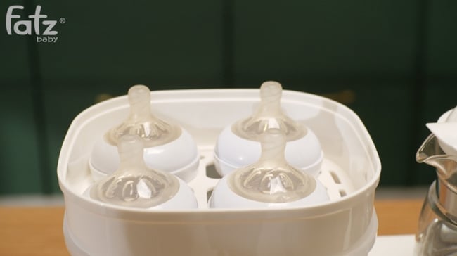Đầu tiên đổ 110ml vào đế của Fatzbaby Multimax, sau đó lắp giá đỡ bình sữa lên trên, đặt bình sữa cần tiệt trùng và đóng nắp lại. Tiệt trùng lên đến 4 bình sữa cho bé.