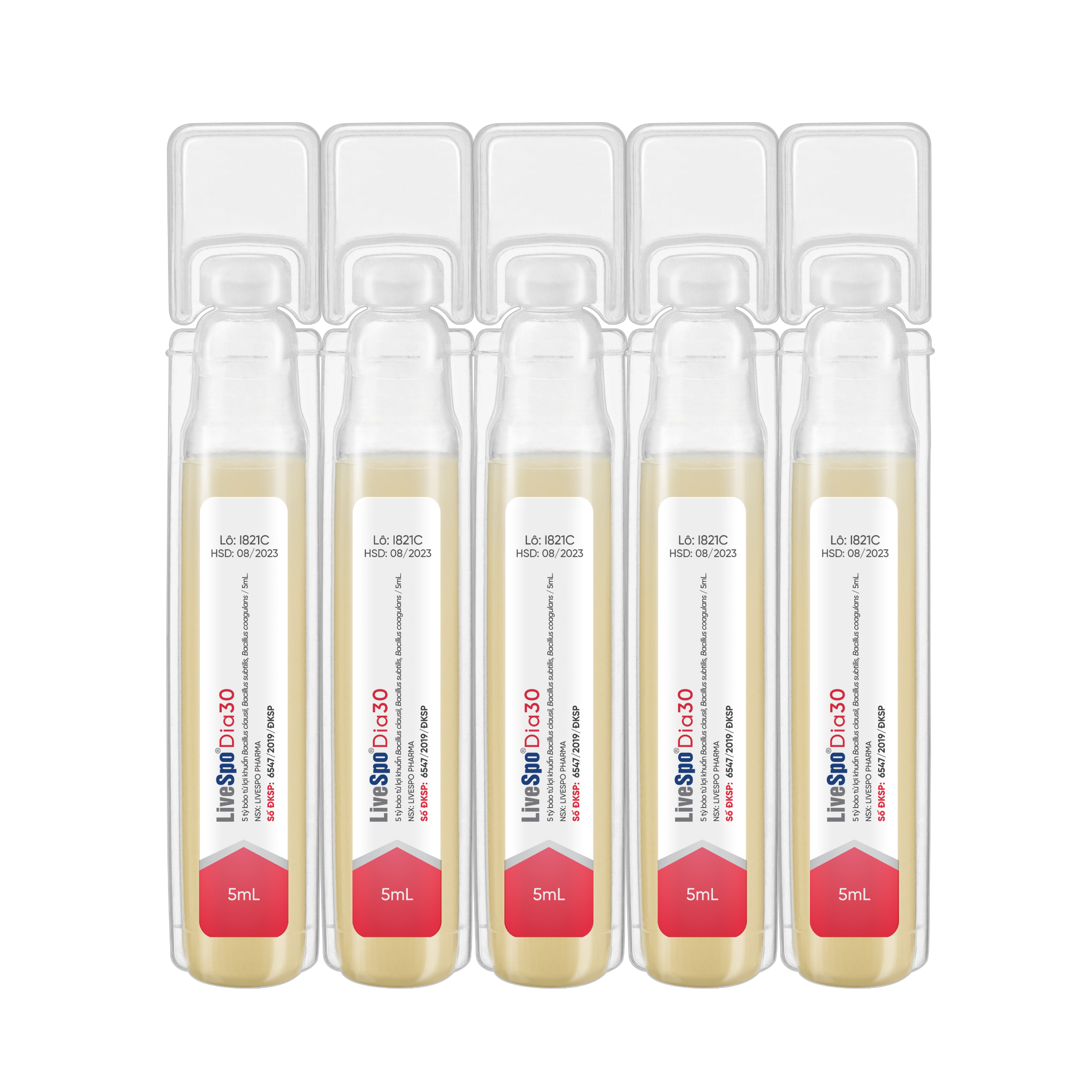 LiveSpo DIA 30 chứa 5 tỷ lợi khuẩn bào tử lợi khuẩn Bacillus Subtilis, Bacillus Clausii, Bacillus Coagulans, cùng 5ml nước cất vừa đủ, ứng dụng công nghệ tiên tiến giúp giải quyết tiêu chảy cấp, rối loạn tiêu hóa nhanh hơn hẳn so với các sản phẩm thông thường.