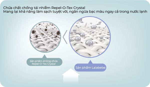 Khả năng làm sạch mạnh mẽ và ngăn ngừa bạc màu ngay cả trong nước lạnh nhờ Nước Giặt Thuần Chay Lalabebe có chứa chất chống tái nhiễm Repel-O-Tex Crystal - ngăn chặn sự tái lắng đọng các vết bẩn trên sợi vải
