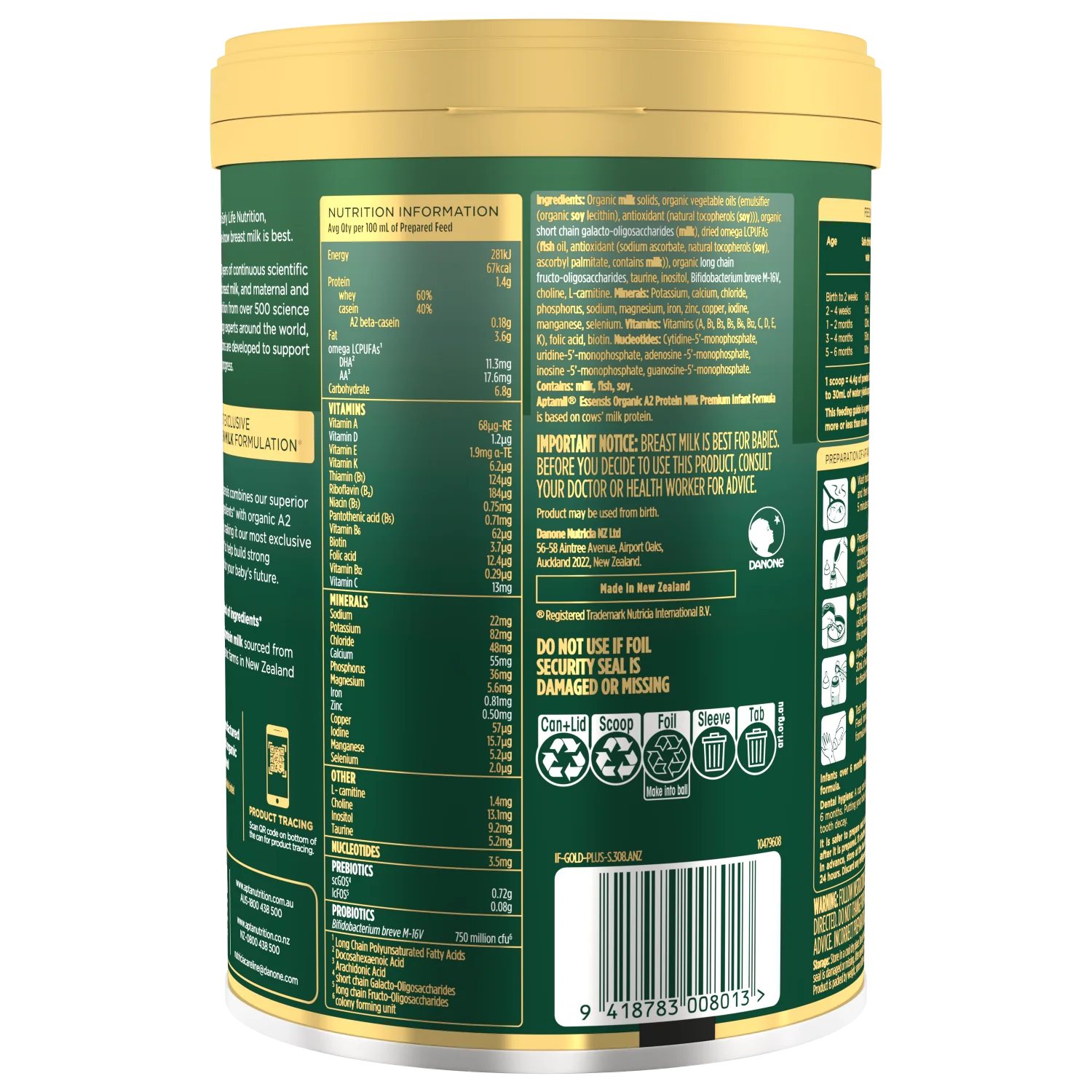 Sữa hữu cơ (15,8%); dầu thực vật hữu cơ [Chứa chất nhũ hóa (lecithin đậu nành hữu cơ (E322 (14,7%); Chất chống oxi hóa (tocopherols tự nhiên (Đậu nành)) (14,5%)], Chuỗi ngắn galacto-oligosaccharides hữu cơ (Sữa) (10,4%); omega khô LCPUFAs [dầu cá (7,1%), chất chống oxi hóa (Natri ascorbate (E301) (6,6%), tocopherols tự nhiên (Đậu nành) (5,7%)], chuỗi dài fructooligosaccharides (4,5%), taurine (3,3%), inositol (3,06%), Bifidobacterium breve M-16V (750 triệu cfu /100ml) (2,005%), choline clorid (2,58%), L- carnitine (0,008%). Các chất khoáng: Kali (2,51%), Canxi (2,33%), Clorid (2,29%), Phospho (2,22%), Natri (2,13%), Magie (0,03%), Sắt (0,05%), Kẽm (0,03%), Đồng (0,003%), Iốt (0,009%), Mangan (0,003%), Selen (0,001%).