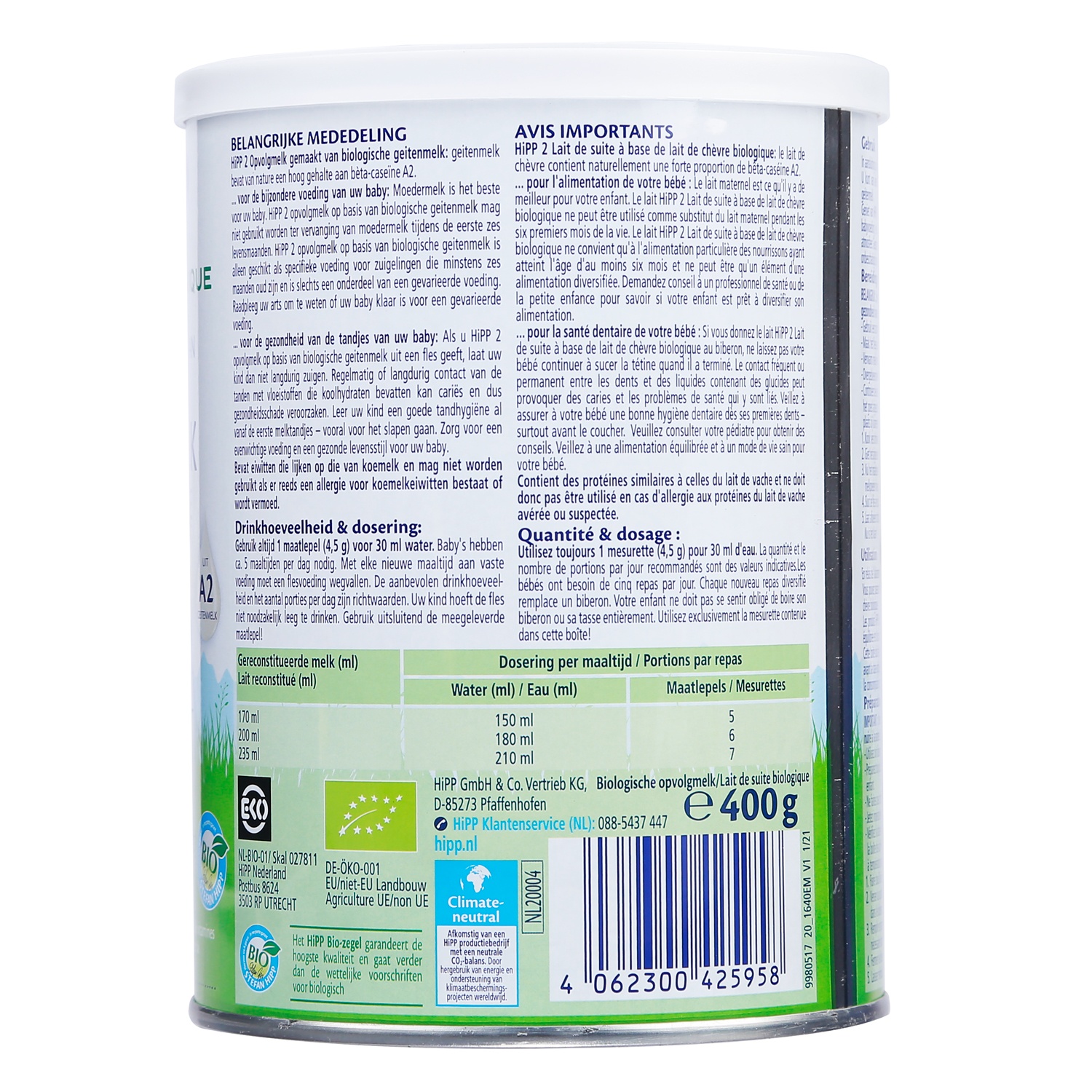 Tỉ lệ pha tiêu chuẩn: 13,5 g HiPP 2 Organic từ Sữa dê + 90 ml nước = 100 ml sản phẩm đã pha.