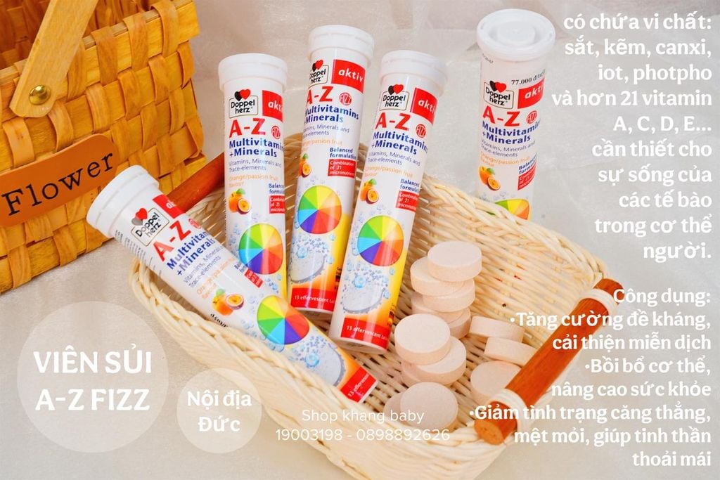 A-Z Fizz là sản phẩm dinh dưỡng có chứa vi chất sắt, kẽm, canxi, iot, photpho và hơn 21 vitamin A, C, D, E… cần thiết cho sự sống của các tế bào trong cơ thể người. Sản phẩm có các công dụng chính như: